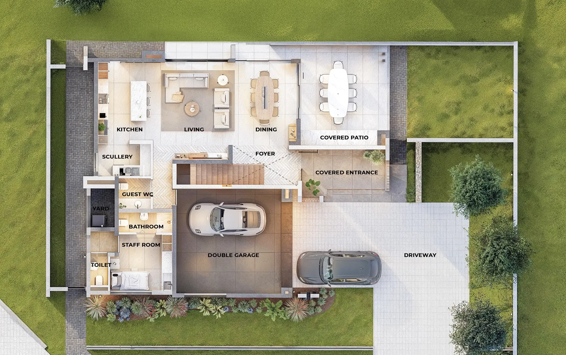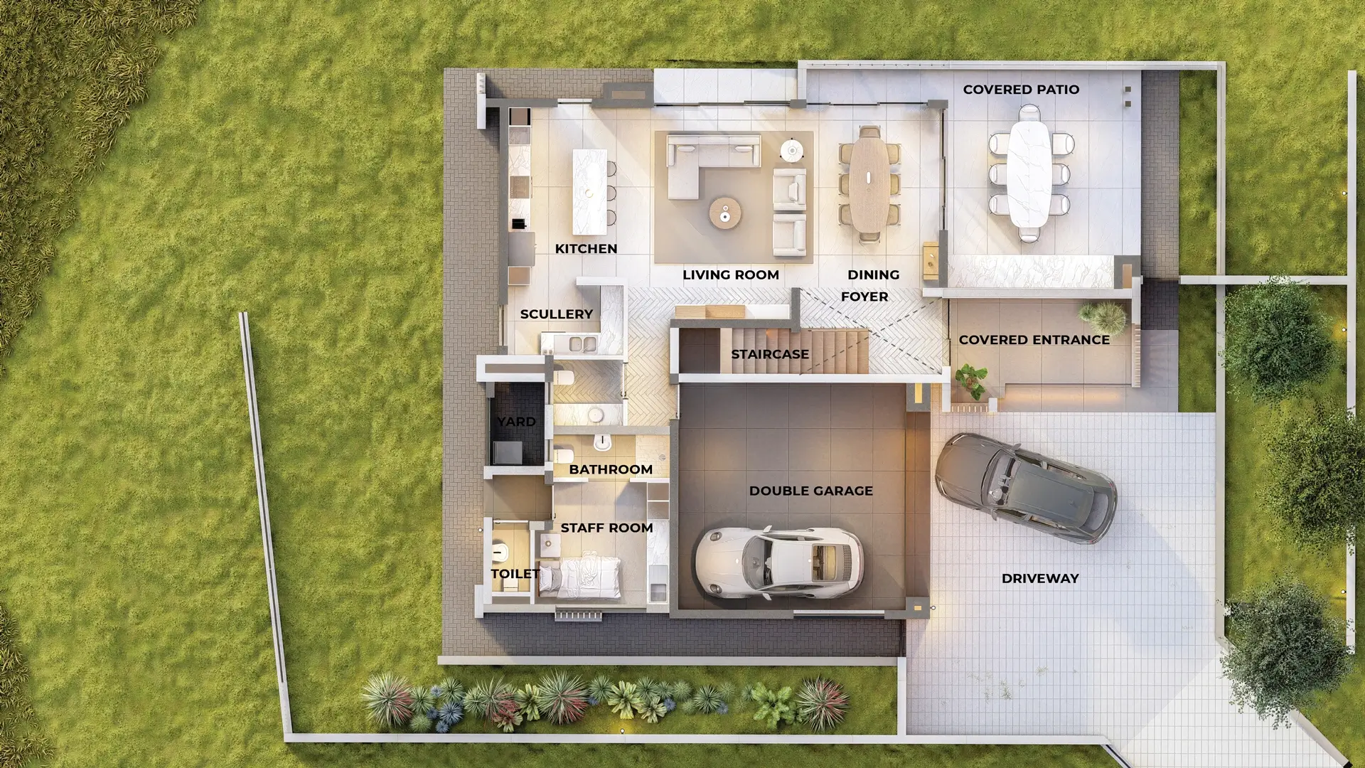 The Type B residence offers 360m² of generous, refined living for families who value space, privacy and an elevated lifestyle within The Terraces at Steyn City. Clean architectural planes, warm timber screens and expansive glazing frame uninterrupted views across the estate, while a calm palette of smooth plaster and concrete look tiles is softened by natural textures and deep shadow lines. Inside, open plan living flows seamlessly from lounge to dining room to covered patio, with full height glazing drawing the gardens and landscape into the home. Soft lighting, oak tones and marble inspired finishes create an atmosphere of quiet luxury, complemented by a sculptural yet practical kitchen and four bedroom suites designed as serene retreats. A spacious upper level lounge enhances the sense of comfort and versatility, completing a home crafted for contemporary family living within one of Johannesburg’s most sought after residential environments.