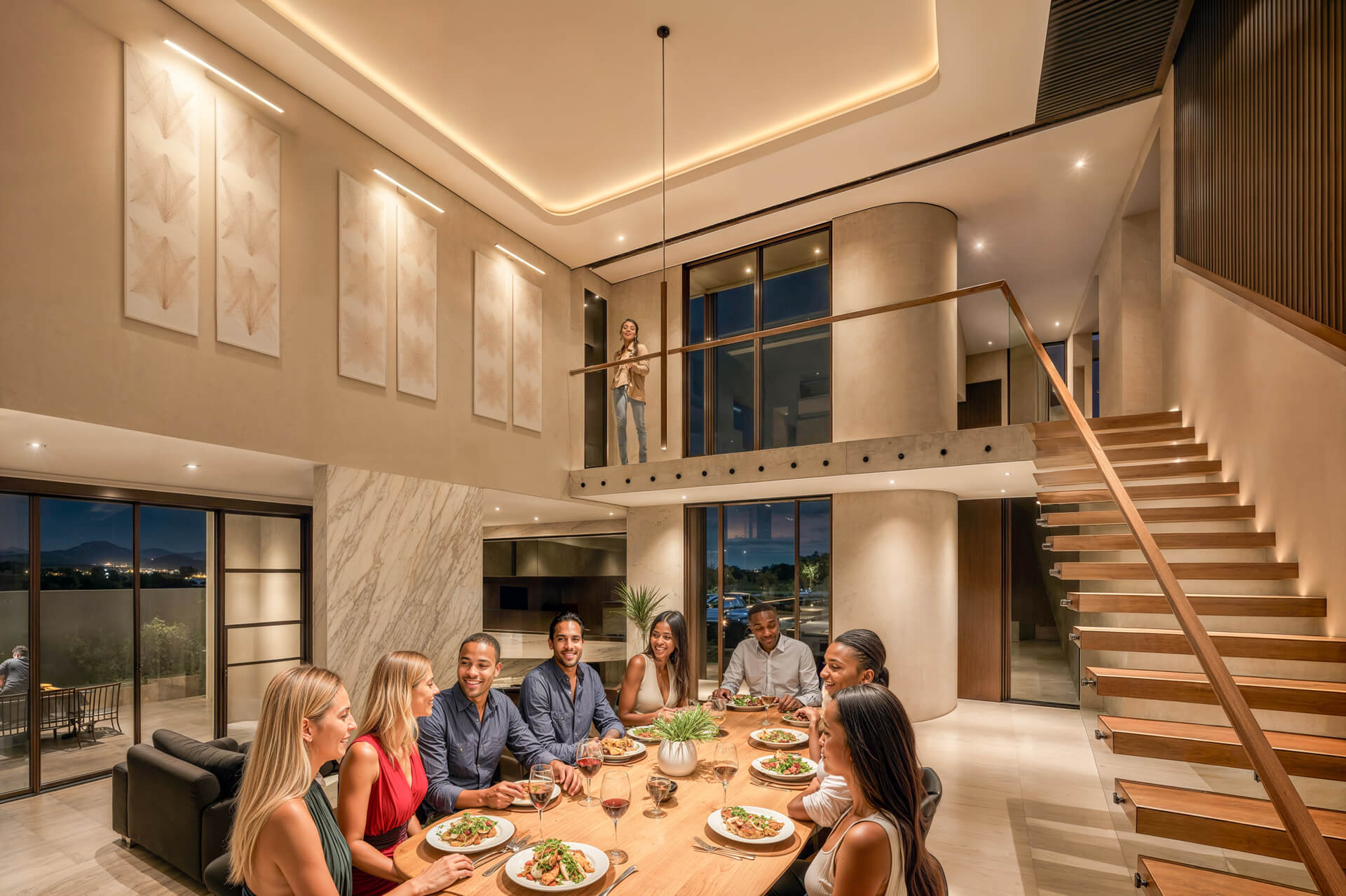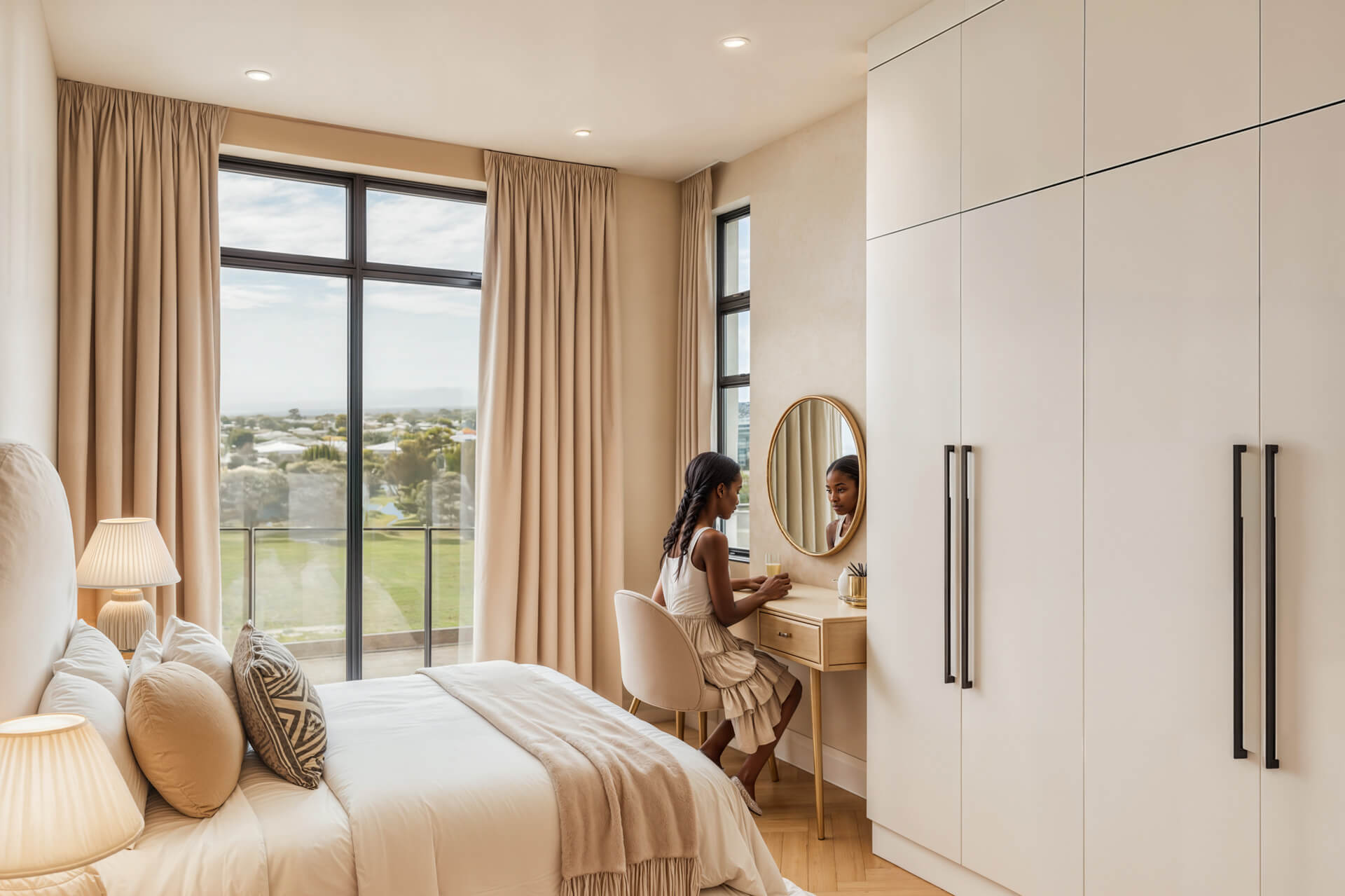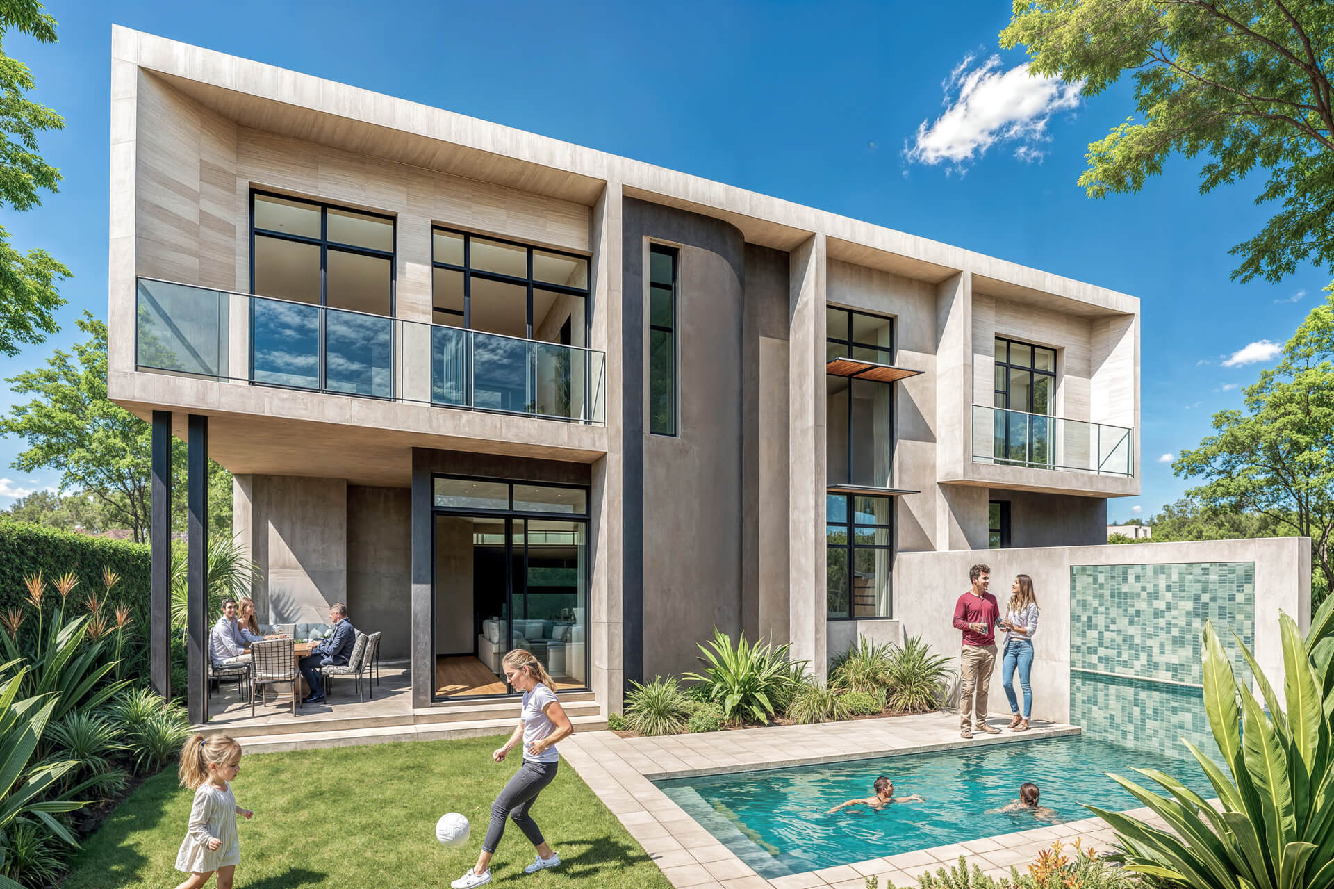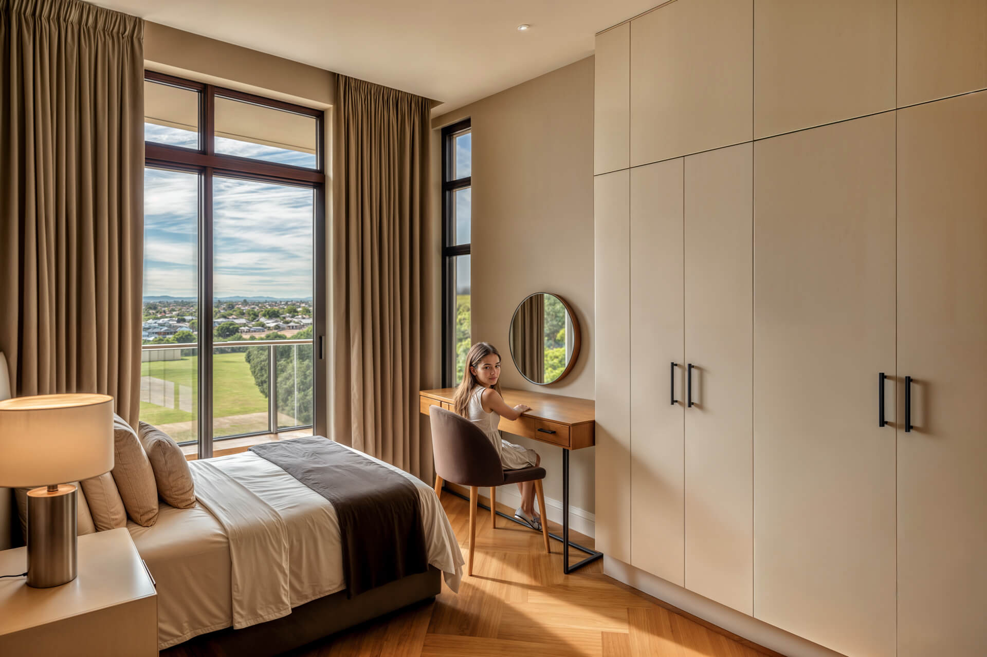 Inside, the home is shaped by generous proportions, refined detailing and a sophisticated palette of timber, stone and soft neutral tones. Open plan living flows effortlessly onto the covered patio, while the kitchen acts as a functional and elegant centrepiece. The main bedroom suite offers a private retreat with expansive views and a serene atmosphere, complemented by three additional en suite bedrooms and a light filled pyjama lounge. With its strong architectural identity, sculpted entrance curve and carefully considered interiors, the Solis Type A Residence offers a rare combination of comfort, exclusivity and enduring design.