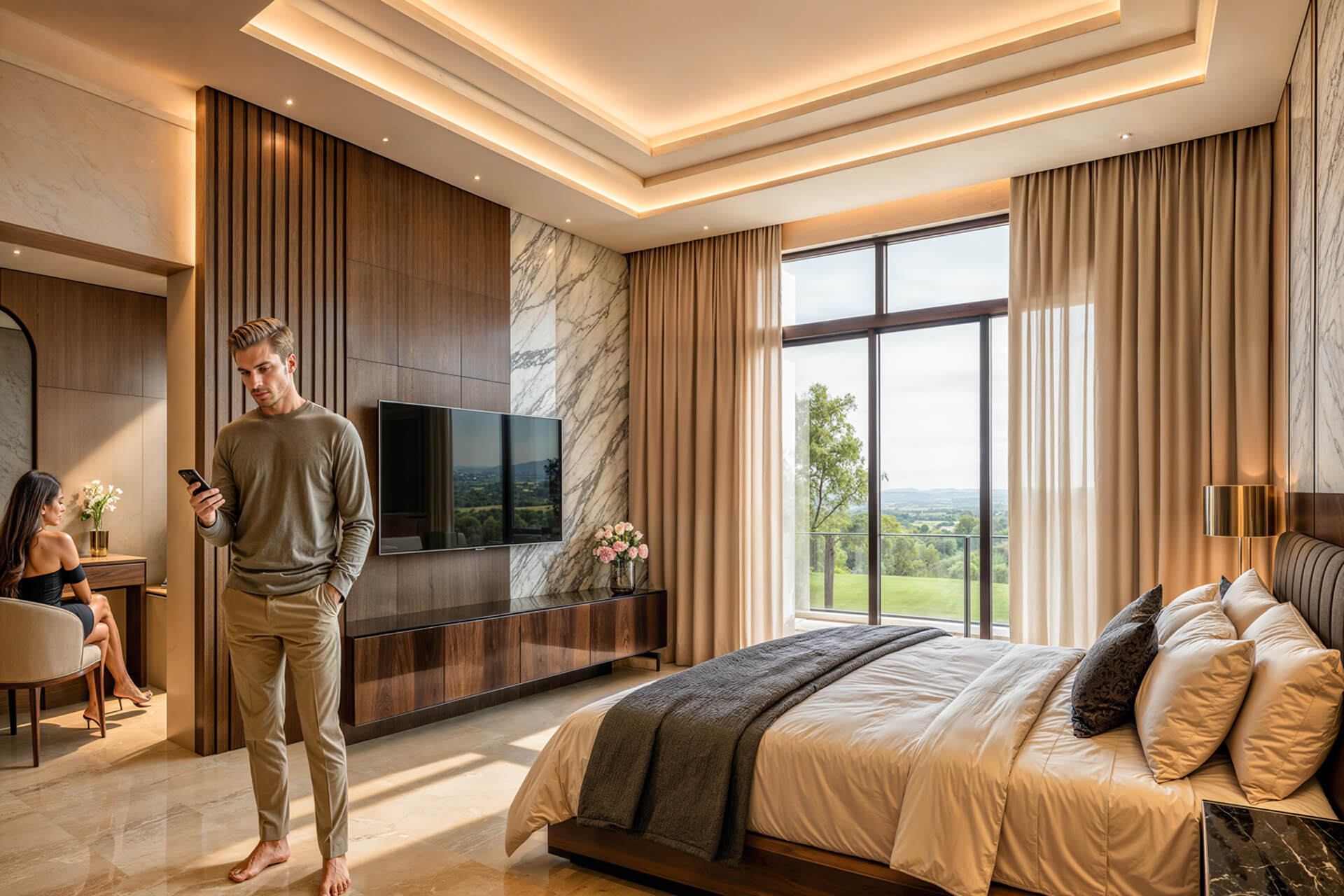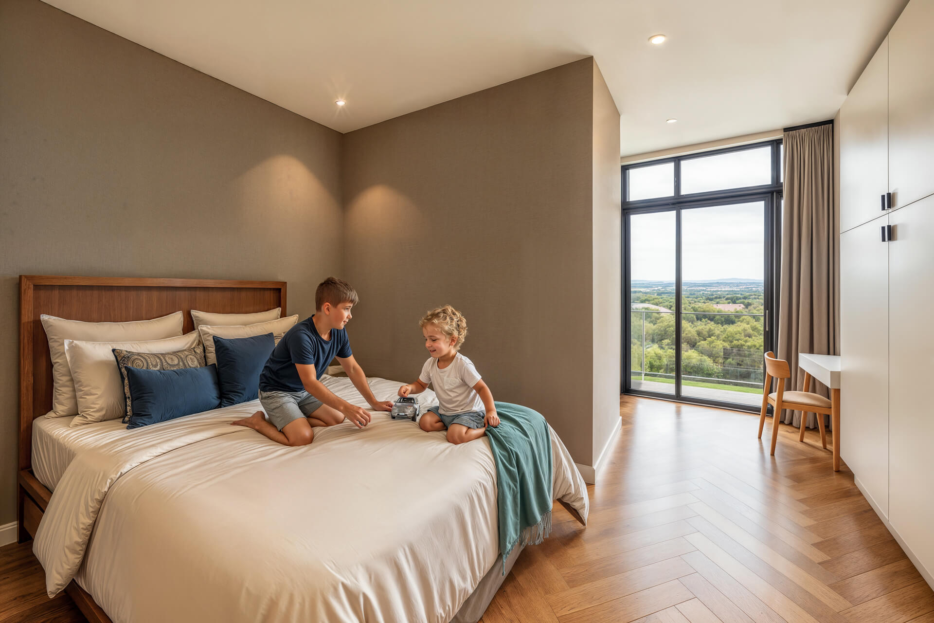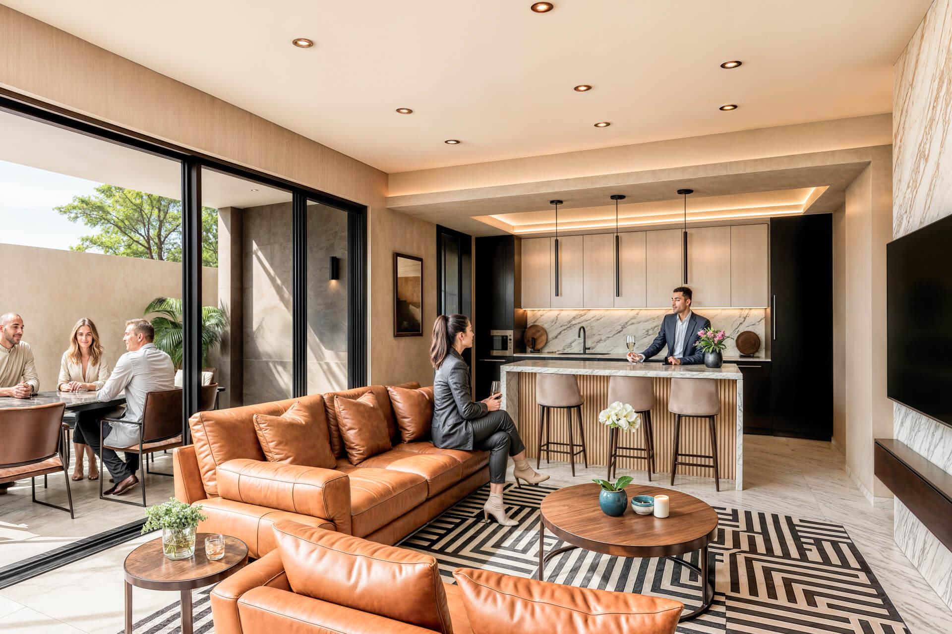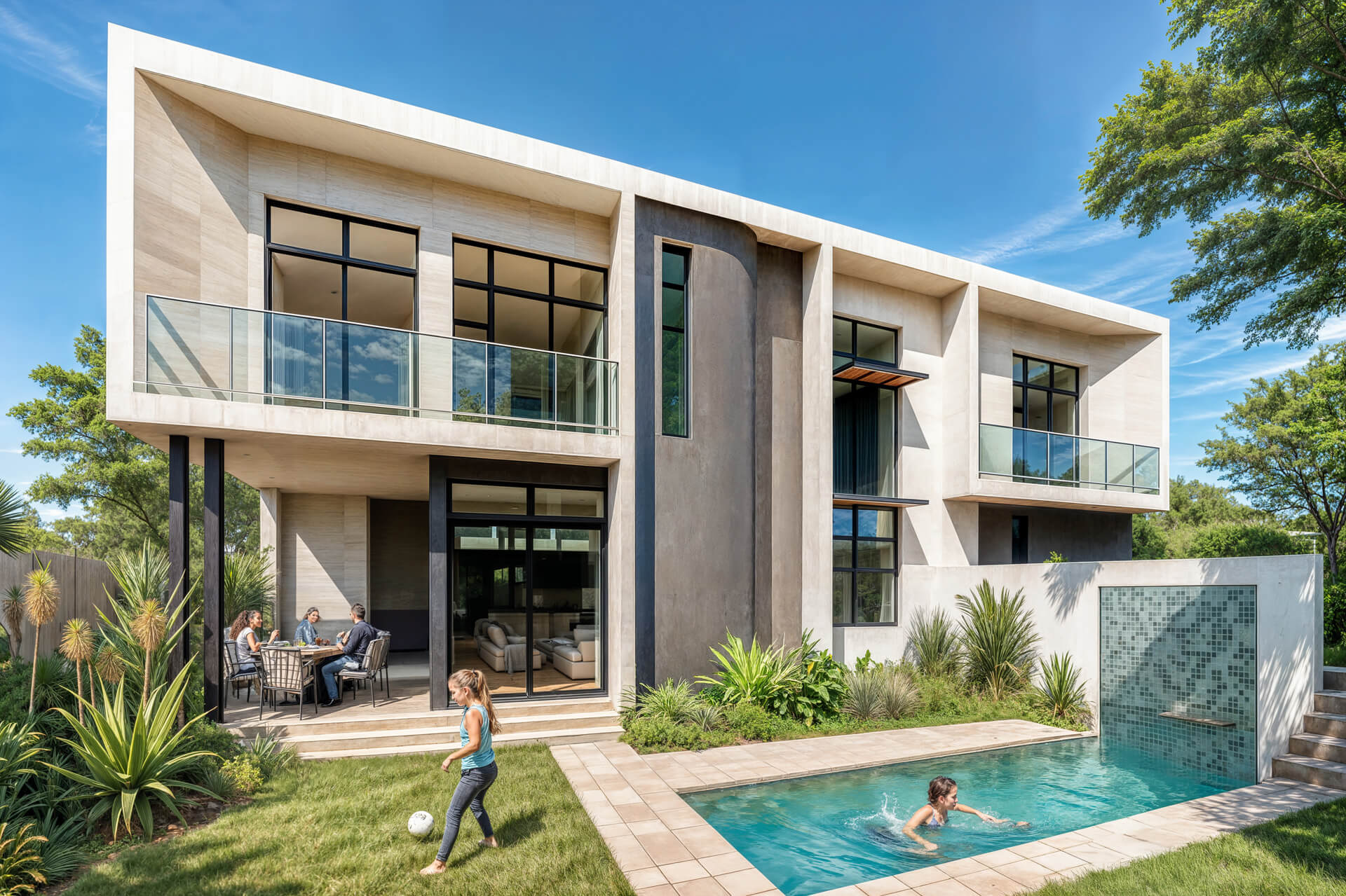 Inside, the home is shaped by generous proportions, refined detailing and a sophisticated palette of timber, stone and soft neutral tones. Open plan living flows effortlessly onto the covered patio, while the kitchen acts as a functional and elegant centrepiece. The main bedroom suite offers a private retreat with expansive views and a serene atmosphere, complemented by three additional en suite bedrooms and a light filled pyjama lounge. With its strong architectural identity, sculpted entrance curve and carefully considered interiors, the Solis Type A Residence offers a rare combination of comfort, exclusivity and enduring design.