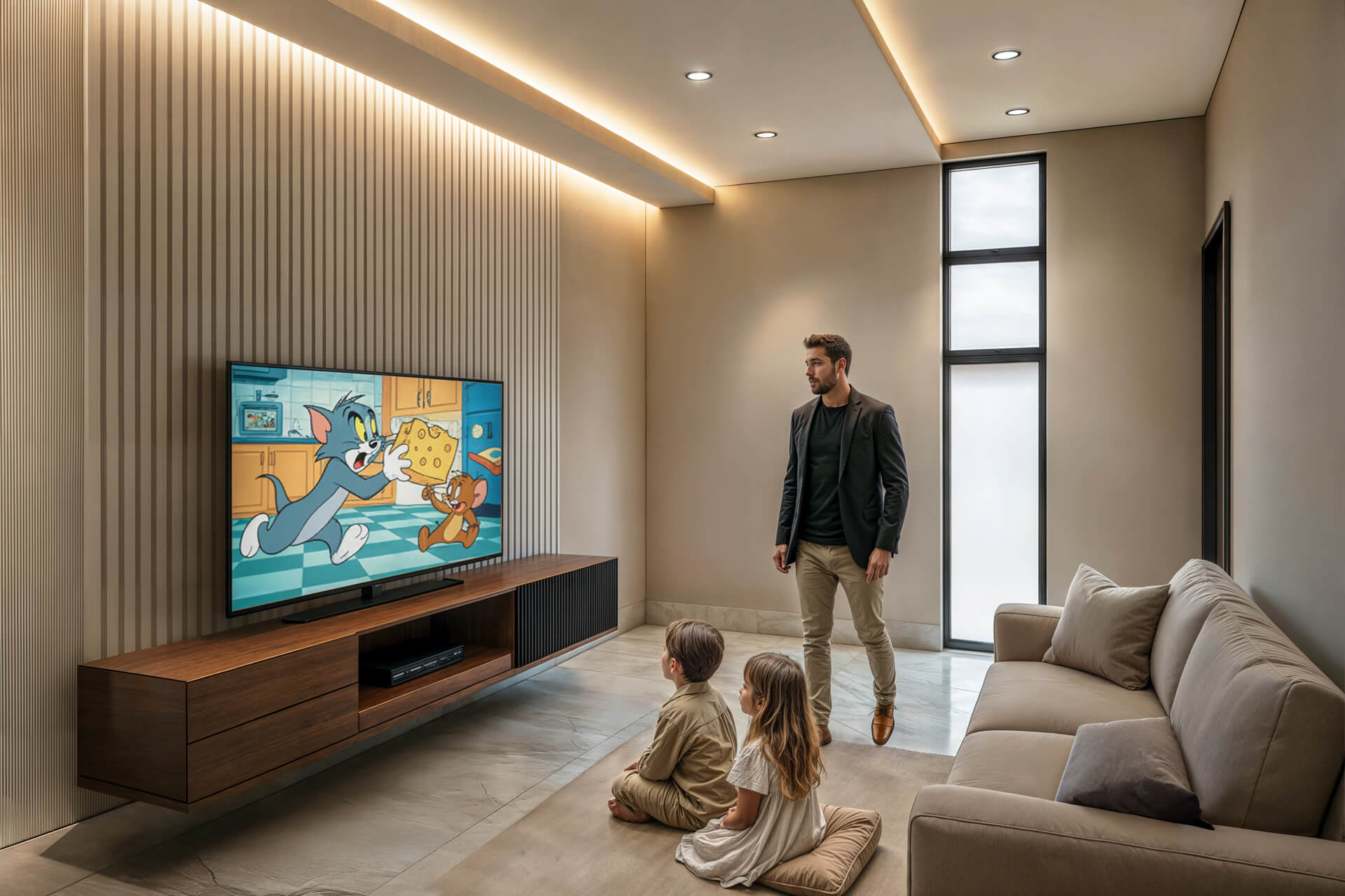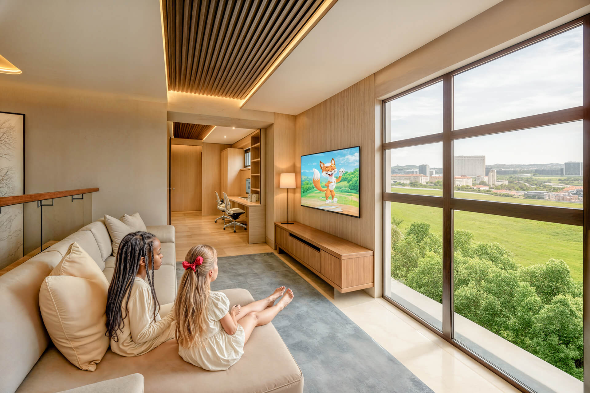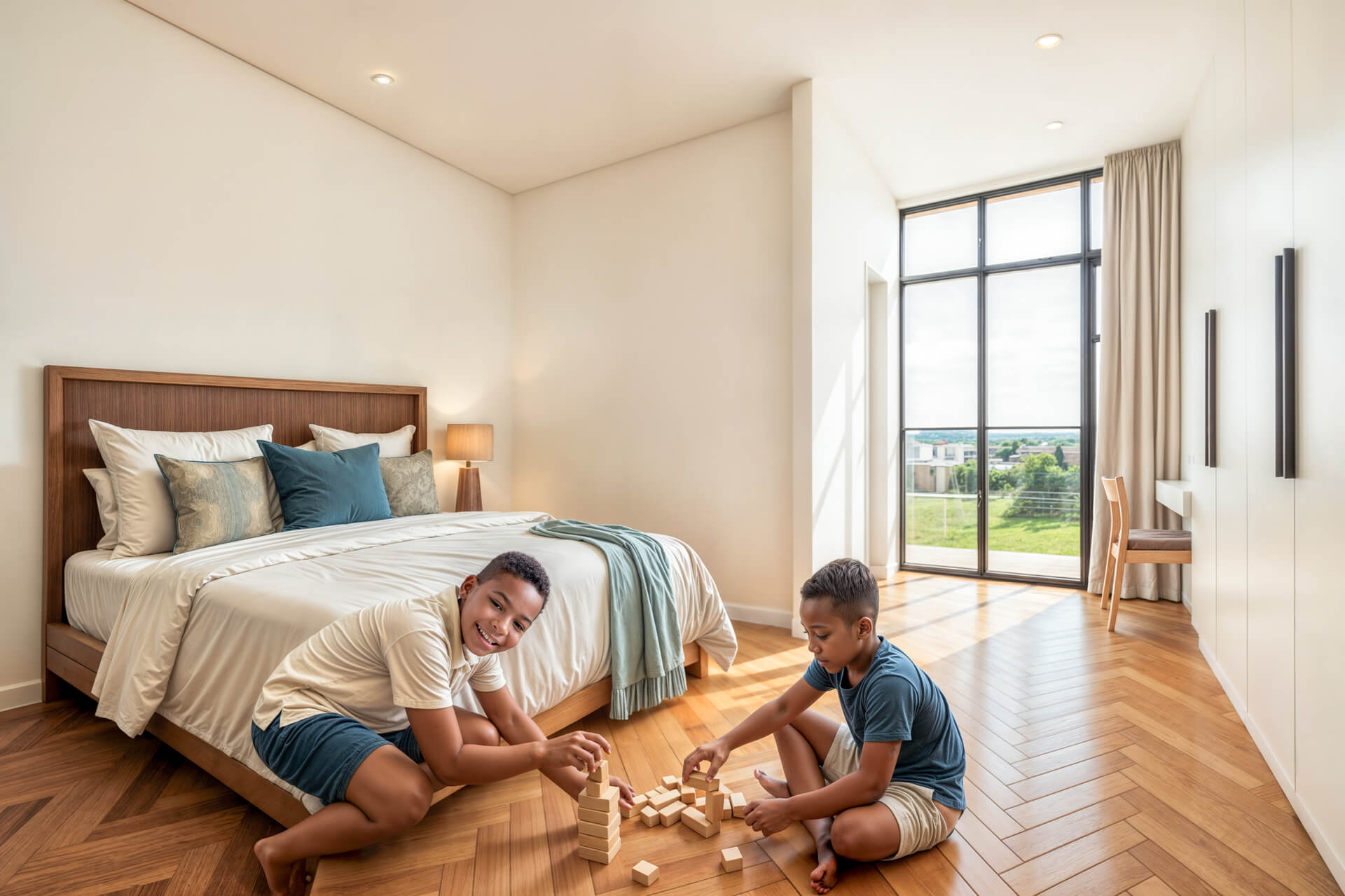 The upper level offers four en suite bedrooms, including a serene main suite with a dressing area, luxurious bathroom and elevated garden views. A light filled pajama lounge provides a versatile family space, and natural oak tones and soft textures throughout the home create an atmosphere of quiet sophistication. With its thoughtful layout, refined material palette and strong connection to its surroundings, the Type B North Entry Residence delivers an exceptional living experience within one of Bryanston’s most discreet luxury developments.